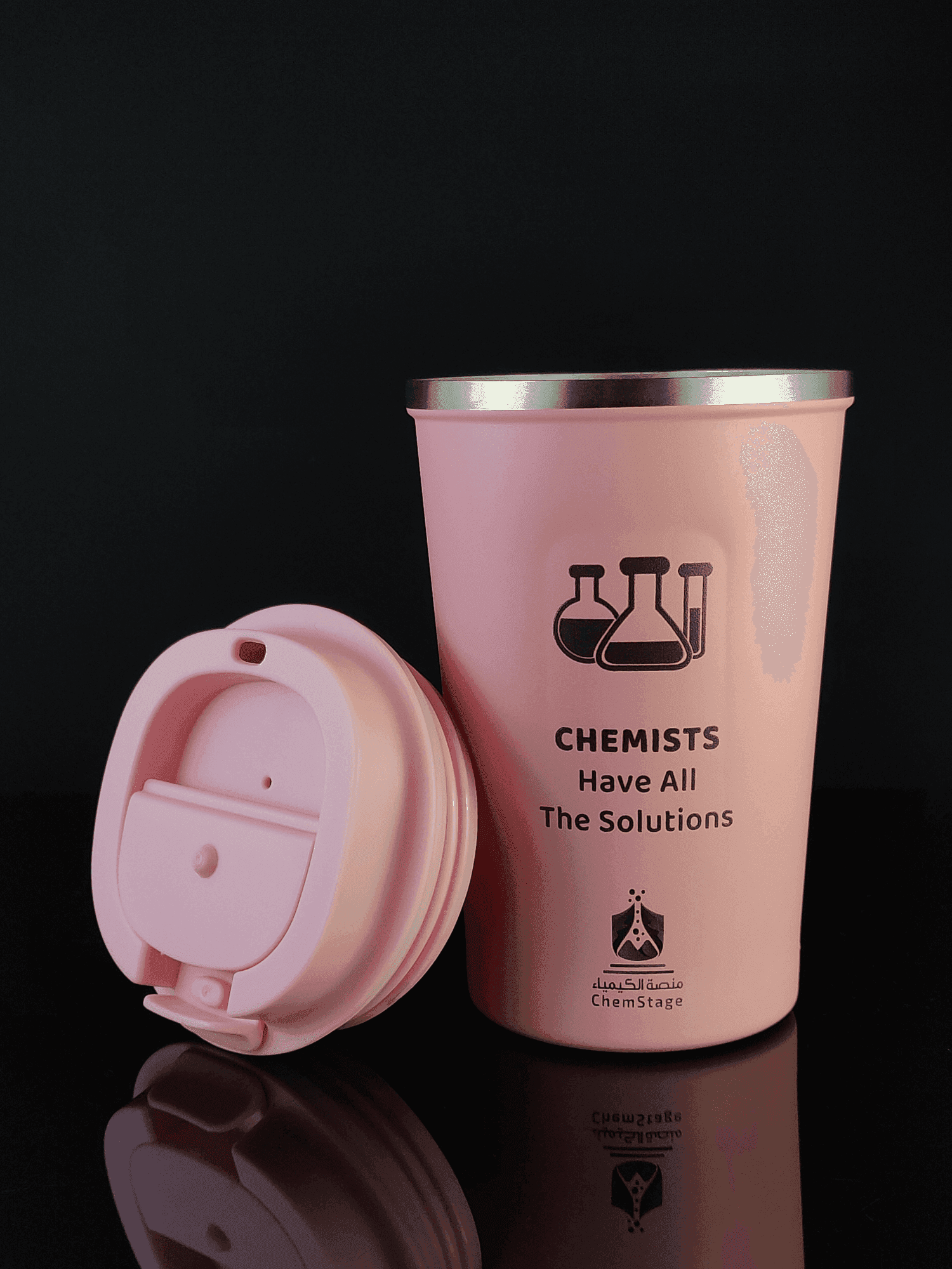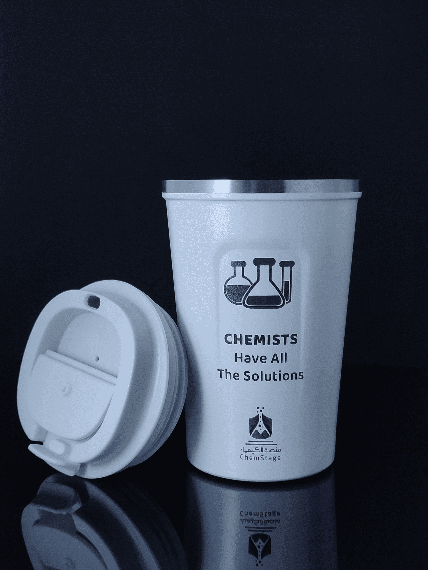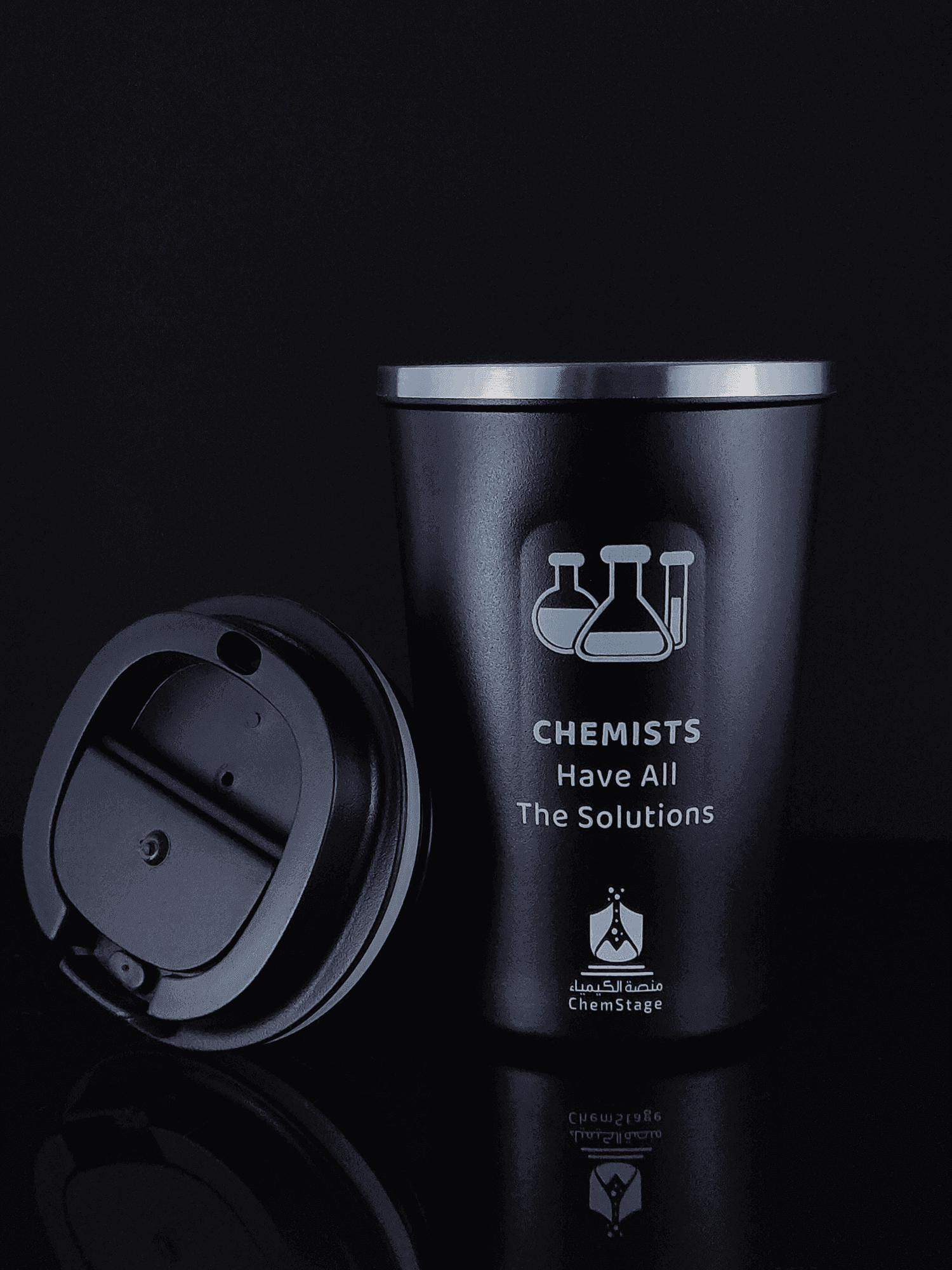 كوب حافظ للحرارة ذا خامة عالية الجودة وجدار ثنائي مفرغ من الهواء لحفظ حرارة المشروبات الساخنة والباردة، مصنوع من ستانلس ستيل 304 الآمن، مع غطاء مانع للتسرب، بتصميم مميز بطابع كيميائي خاص بمنصة الكيمياء.